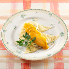薄く伸ばしたパスタ生地にひき肉とポルチーニの具を包んだラヴィオリ。ほんのり甘いカボチャのソースが絶妙に合う!