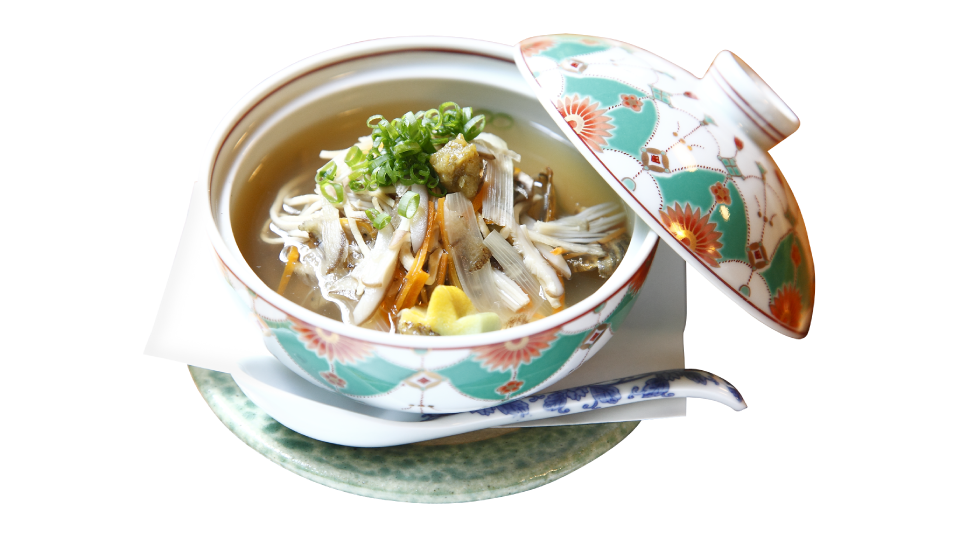 香ばしく炙ったフグのあらとクックエブリオで焼き上げたひれ、かつおだしのスープを入れ、スチームモードで10分蒸した「フグのあら蒸しスープ」。