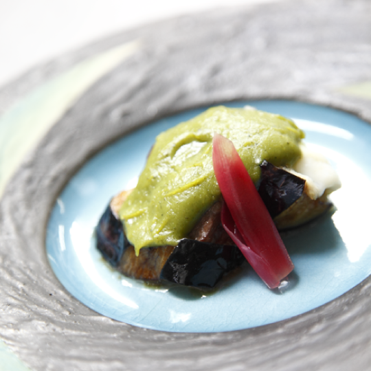 自家養殖のフグと岐阜県の名産・飛騨牛を使用した「フグと飛騨牛と茄子のはさみ焼き」は、「八光苑」ならではの一皿。異色の組み合わせと思いきや、木の芽味噌がアクセントになって、味の相性も抜群です。