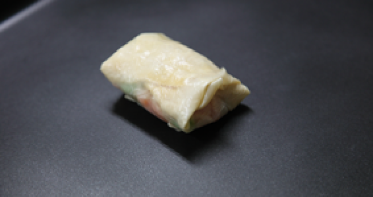 広げた生湯葉の上に、フグの身、トマト、枝豆、モッツァレラチーズをのせて折り畳んで包み込み、20mmのホテルパンにのせる。【設定1】で予熱後、加熱する。
