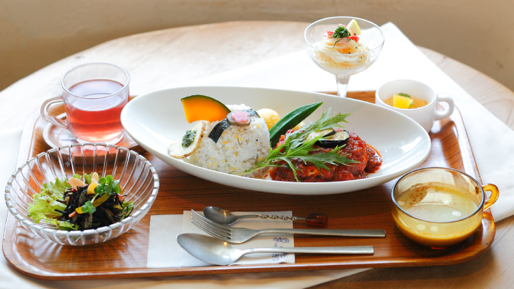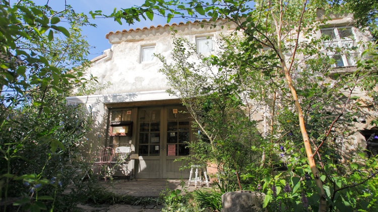 植物性素材のランチやスイーツがいただける菜食レストラン・カフェ。お肉を一切使っていないのにジューシーで満足感のあるハンバーグや、野菜や大豆から作った見た目もそっくりな「うなぎの蒲焼き風」など、食べるワクワク感たっぷりのランチが週替わりで登場します。オーナー・福村さんが考案したメニューは、野菜の色で絵を描くように楽しんで盛り付けされており、一言でいえば「大人のお子様ランチ」。さらに消化が良いため体調が整うことも、人気の秘密です。南フランス・プロヴァンス地方をイメージしたという外観や庭、胸キュンポイントが至る所に散りばめられているカワイイ店内は、ついつい長居したくなる空間です。