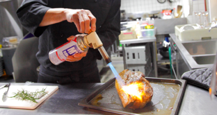 肉のブロックのまま、スチコン(ホットエアー・300℃)またはフライパンを使って、軽く焼き色が付くまで加熱する。さらに焼き色を追加するため、バーナーで表面を炙る。