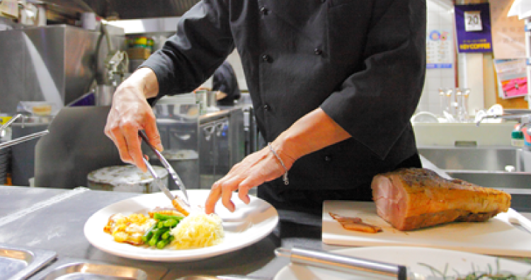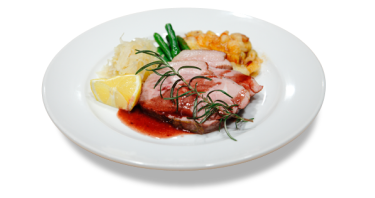 肉を切り分けて盛り付け、付け合わせの料理を添えてソースをかける。