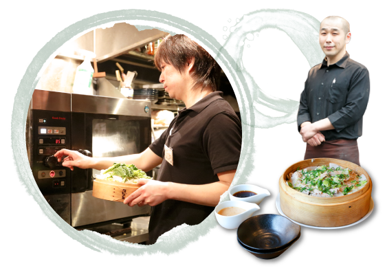 コースメニューにも入れているセイロ蒸しは、今や当店の看板メニュー。中でも「旬の野菜と泉州犬鳴豚のセイロ蒸し」は試行錯誤の結果できた一品です。スチコンを入れるまでは蒸し器でやっていましたが、温度管理がとても難しくて。温度が高過ぎると野菜の繊維が壊れるし、お肉は堅くなって旨味が逃げて全然おいしくないんですよ。 クックエブリオなら低温の一定温度で火が通せるのでカンペキな仕上がりになります。豚のバラ肉は特注でかなり厚めの4mmにスライスしてもらっているんですが、分厚くてもやわらかくジューシーに仕上がっていい感じですね。