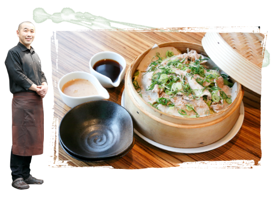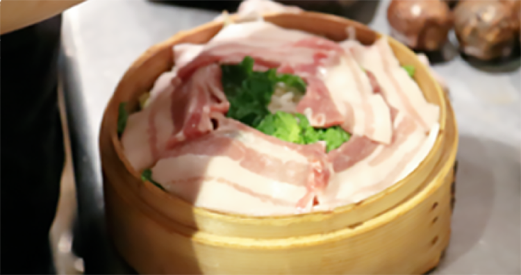 野菜と豚肉を低温かつ時間差加熱することで、素材の食感を損なわずに旨味を引き出した看板メニューのセイロ蒸し。季節の移ろいに合わせて扱う野菜を変えています。厚めにスライスした泉州犬鳴豚の旨味と驚くほどやわらかな食感が印象的でした。今回このレシピを那須さんのご好意により公開いたします。