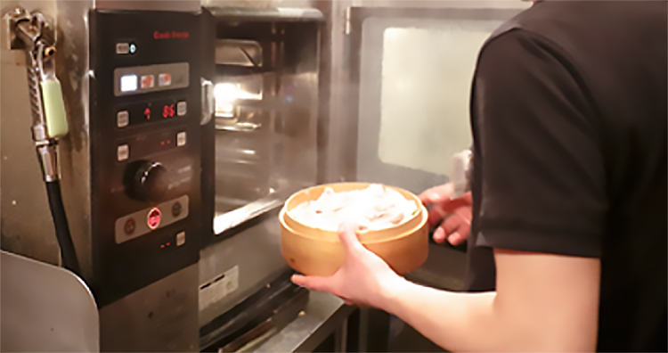 さらに2分後、セイロを取り出し、フタを開けて〈材料b〉を振り、フタをしてスチコンに戻し入れる。