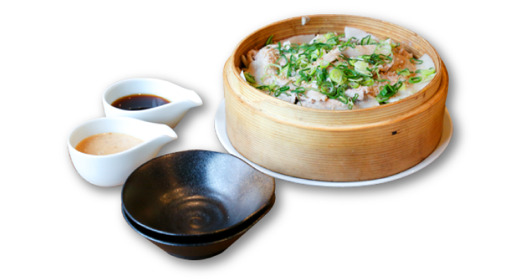 加熱完了後、セイロを取り出し、ポン酢、ごまダレを添える。