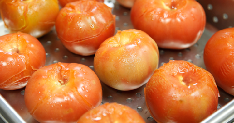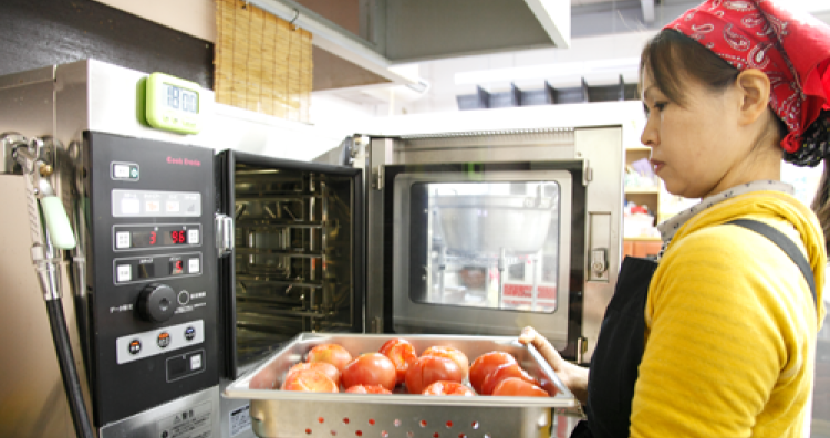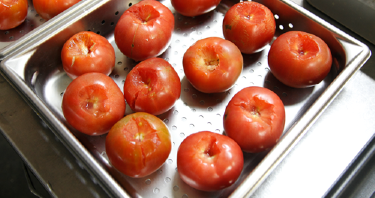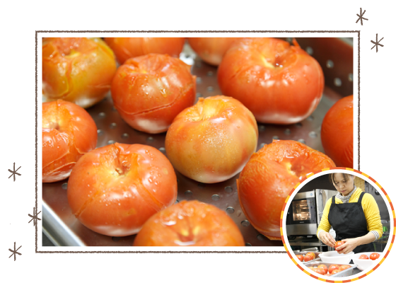 以前は熱湯にくぐらせて、火傷しないよう氷水で冷ましてからおこなっていたトマトの湯むき。クックエブリオ導入以降は、スチームモードを使って簡単にできるようになりました。湯むきしたトマトはトマトピューレにし、カレーやパスタソースのベースとして使用しています。