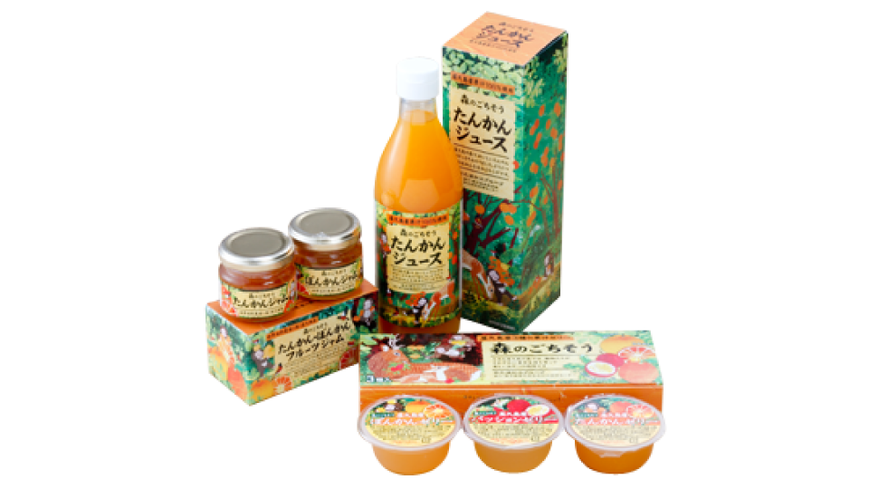 たんかん・ぽんかんを使った宮之浦加工グループの商品。屋久島の超軟水で炊き上げたジャムは、他にはないトロリとした食感です。屋久島の森を表現したパッケージも目を引きます。