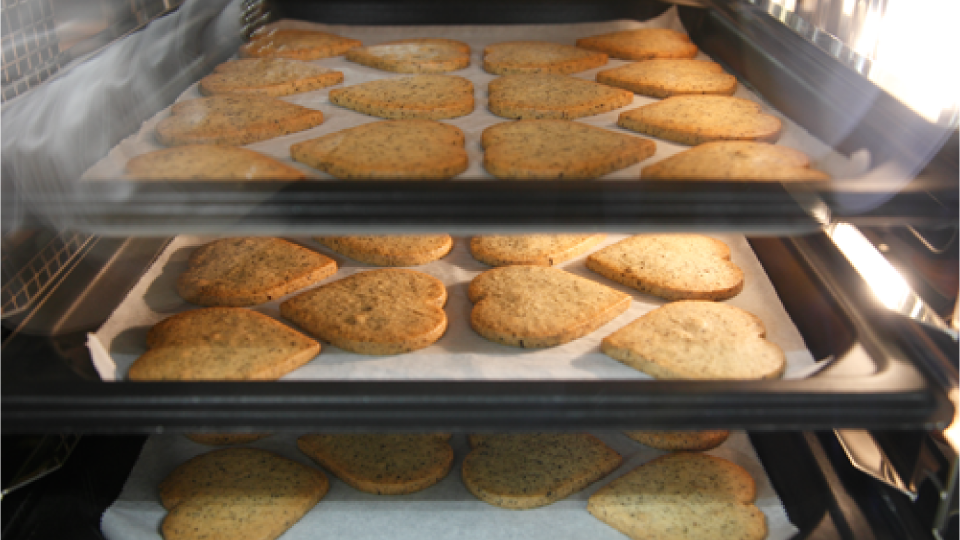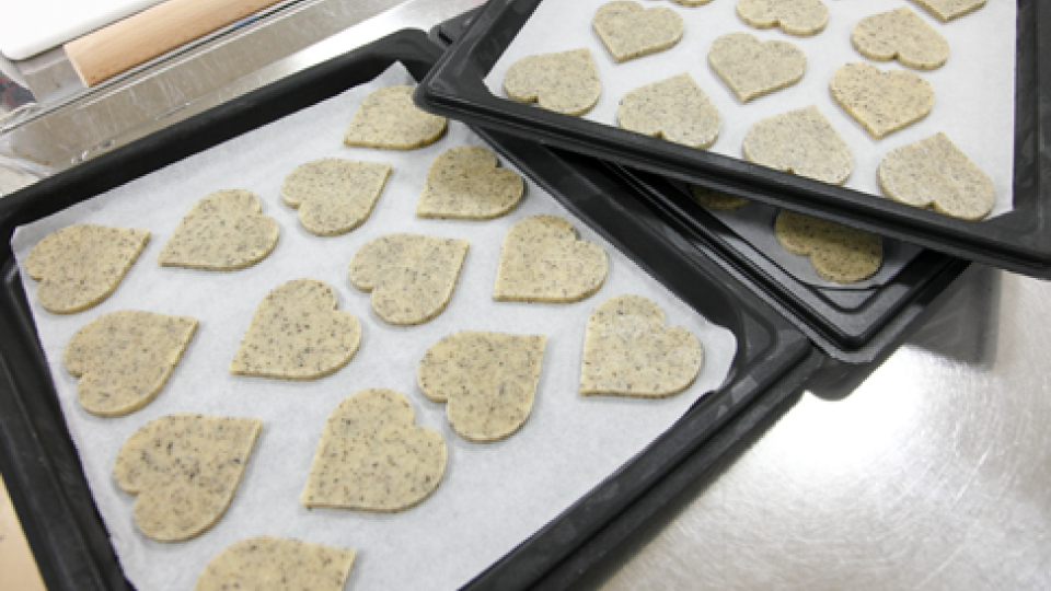 ホテルパン1枚に14枚並べて一度に5段分焼き上げます。緑茶のクッキーだけは緑色をキレイに出すために少し低い温度で焼いているそうです。