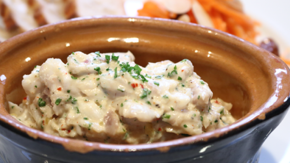 肉の看板メニューが「パテ アンクルート」なら、魚の看板メニューは「鮮魚のリエット」です。蒸してほぐした白身魚に自家製マヨネーズやハーブなどを入れたディップ的な料理ですが、白身魚の火入れで仕上がりに差が出ます。 蒸し器を使うと温度管理が難しく、蒸し過ぎてパサついたり、逆に火入れが甘いと生臭くなったりして安定しません。スチコンなら鯛のフィレ1枚につき85℃のスチームモードで10分程度蒸すと、ムラもなくフワッとした仕上りに。 食感を活かすため、粗めにほぐしてザックリ混ぜると、白身魚の良さが前面に出たリエットになります。