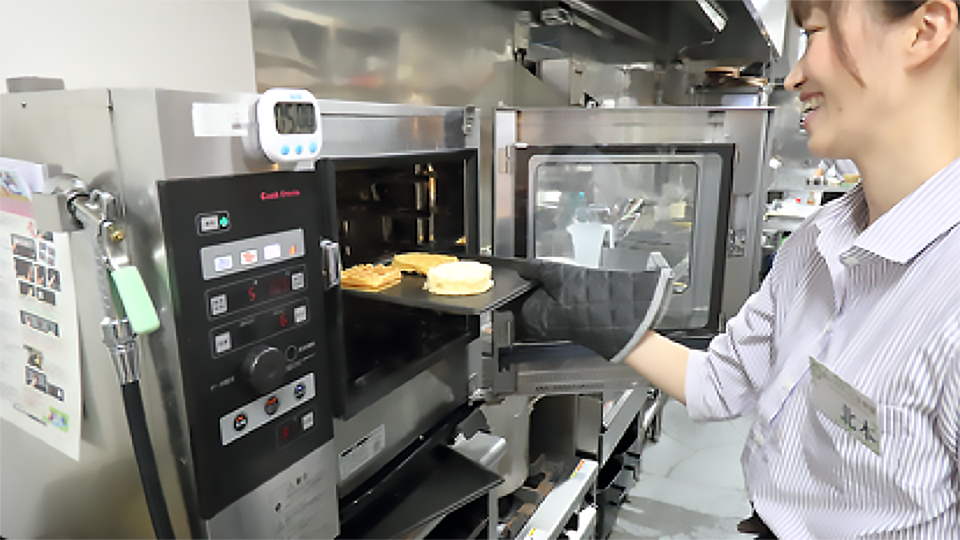 20人以上いるスタッフのうち、店長と私以外は全員パートやアルバイトです。基本的にキッチン専任のスタッフが調理しますが、忙しくなるとホールスタッフもスチコンを操作します。 午前中にみえるお客様の大半がオーダーする「ブランチセット」は、ドリンク代に+100円でトーストや卵、ソーセージが付くので、スチコンはフル稼働。トーストはホットエアー・250℃で3分と早く、5人分を一度に焼けるので助かります。ボタン一つで扱いやすく、高校生から主婦のスタッフまで使いこなしていますよ。