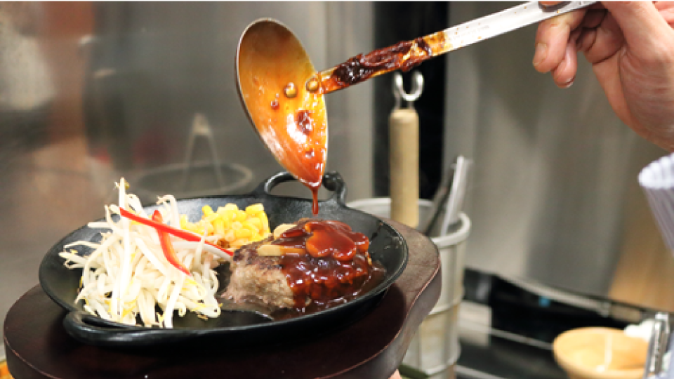 国産肉100%の手ごねハンバーグは、当店のこだわりメニューです。オープン当初からコンサル室やスタッフと相談しながら改良をくりかえし、ようやくレシピと調理設定が安定しました。 鉄板で両面にサッと焦げ目を付け、コンビ・230℃・水蒸気量90%で5分焼くだけ。トータル7分で、ふっくらジューシーなおいしさを提供できます。 また、一度にたくさん手間なく焼けるので、10人前などのまとまった注文も、スムーズに対応できるようになりました。