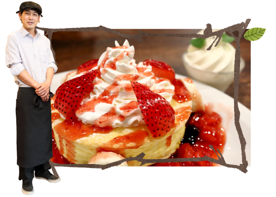首都圏を環状にむすぶ国道沿いは、大手飲食チェーン店が立ち並んでいます。ここで勝負するには強力な看板メニューが必要と感じ、ホシザキのコンサル室に相談しました。管理栄養士の資格を持つ女性が多く、なによりメインターゲットの「女性」目線での提案があると確信して。 ほかにはない、新感覚のパンケーキを作りたいと伝えると、レシピからスチコン設定まで、きめ細かくアドバイスいただきました。 意見を交わして何度も試作を重ね、ついにパンケーキが完成。インパクトあるおいしさにファンが生まれ、お客様も増えています。