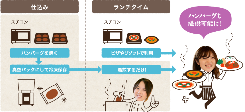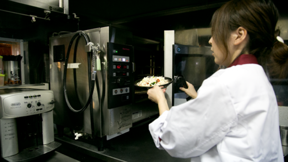 ランチメニューは5〜6割、スイーツは9割にスチコンを使っています。 ガスコンロと違って途中で火加減や焼け具合を見る必要がなく、加熱完了のブザーが鳴るまで他の作業に集中できて大助かり。結果として作業時間を短縮できます。焼きトマトリゾットのオーダーが同時に10食入った時も、一気に調理できてスムーズにご提供できました。 私たちみたいに少人数運営(調理1名、ホール1名)のカフェには、なくてはならない存在ですね。 小さい厨房にマッチしたコンパクトさや、クリーニングモードで掃除がラクな点も気に入っています。