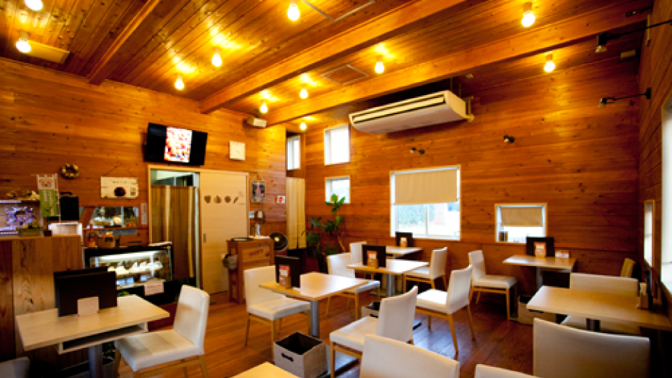 ログハウス風のウッディーな店内からは森田農園の田んぼが見渡せます。ここかしこに女性らしい細やかな心遣いが表れ、とてもリラックスできる空間でした。