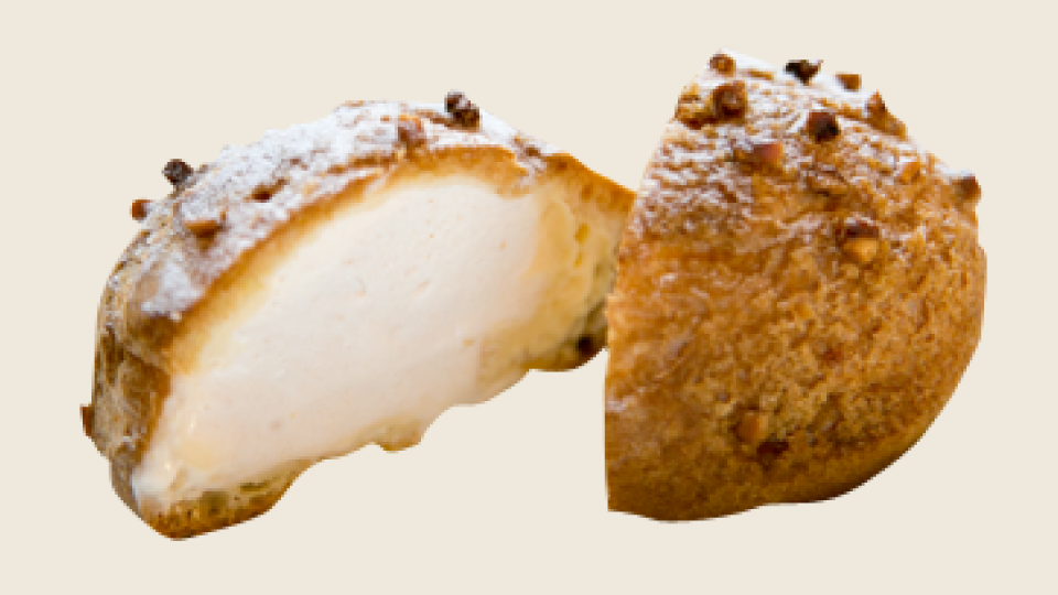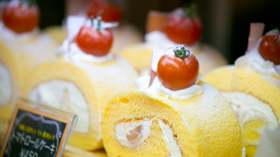 トマトロールケーキとトマトのクッキーシュークリームは毎朝ホットエアーで焼いています。「トマトの味が前面に出すぎないよう工夫しました」とスイーツ担当の薫さん。クリームにトマトの優しい甘さがほんのり感じられました。