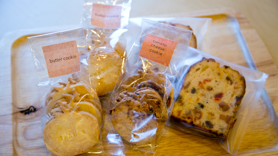 焼き菓子3種類や、富山県のふるさと認証商品にも選ばれているトマト100%のジュースがエントランスを賑わします。今後はここにトマトソースやジャムが仲間入りするかもしれません。