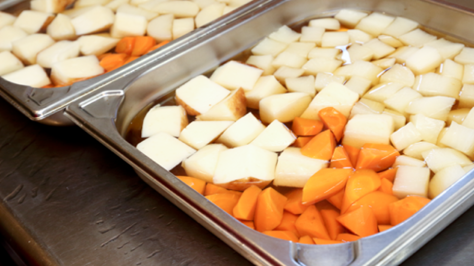 生産者が朝採って直接持ち込んだ野菜は、新鮮そのもの。野菜の力が強いから、蒸すだけで十分おいしいんです。 鍋で茹でると栄養や旨味がお湯へ流れ出てしまいますが、スチコンのスチームモードなら旨味をギュッと凝縮。特にキャベツや白菜は甘さが際立ちますね。 時間差でホテルパンを出し入れしたら、根菜から葉物まで、数種類の野菜を一度に下ごしらえでき、早い早い。蒸し器のように水を張って沸かす必要もないし、掃除が楽なのも魅力ですね。