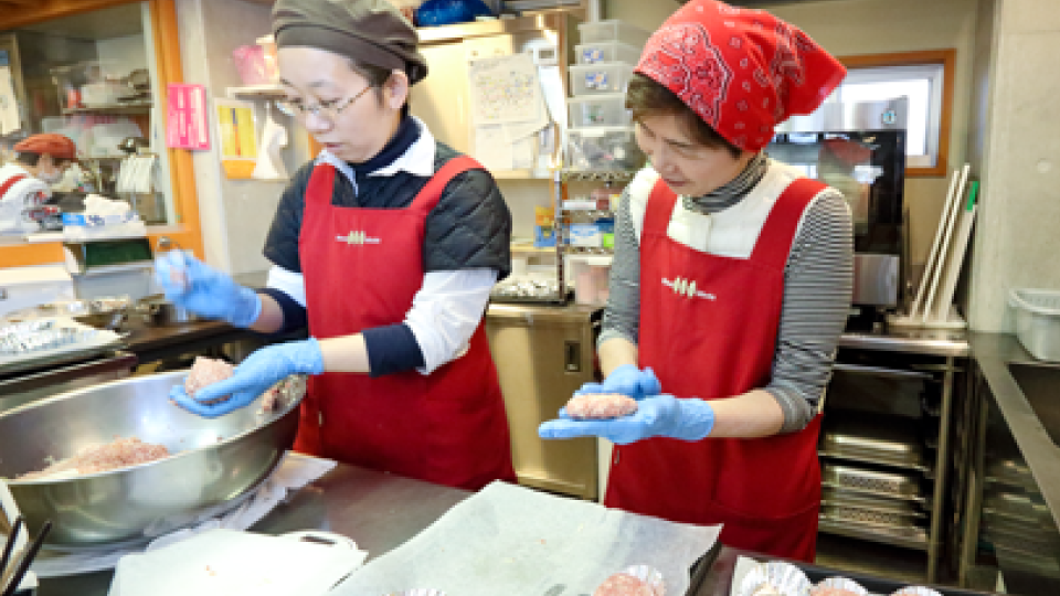 「なんとポーク」と「五箇山豆腐」のおからを使った「おからハンバーグ」。手際の良い流れ作業で、ホテルパン4枚分があっという間に完成しました。日替わりのソースをかけて提供します。