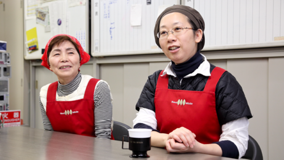 笑顔が絶えない法野さん(右)。長年給食センターで勤務し、スチコン使用経験のある河合啓子さん(左)のアドバイスを受けながら、日夜献立作りに励んでいます。