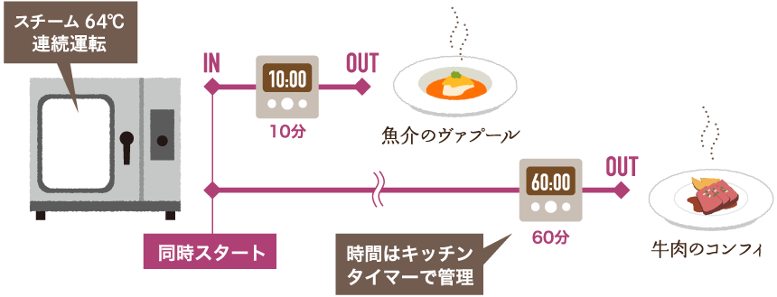 うちは総席数が30席。二人組のお客様で満席になると、お料理をお出しするタイミングは少なくとも15パターンになります。お待たせせずに出来立てをサーブするには、効率の良いスチコン使いがカギですね。 例えば魚料理をスチームで蒸し始める時に、メインとなる肉のコンフィも一緒に入れてタイマーで管理。順番に取り出して仕上げれば、コースの流れにもマッチします。 スチコンと時間の有効活用が、少ない調理スタッフで厨房を回すコツかもしれません。