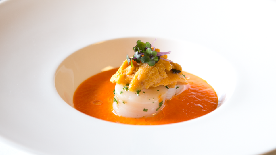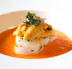 東京のジョエル・ロブションでの修業時代にヒントを得た「平貝のヴァプール 赤パプリカとウニ」。生でもなく、完全に火が通った状態でもない、絶妙な火入れが魅力です。
