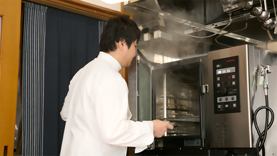 コース料理が基本で、前菜からデザートまでランチは5品、ディナーだと10品ご用意します。品数が多く調理法も様々なので、蒸す・焼く・温めるなどスチコンは常にフル稼働です。 スチームで低温調理をしてから高温のホットエアーへ切り替える場合も、ものの数分で予熱が完了。 逆のパターンもクーリング機能を活用すれば素早く切り替えられ、ロスタイムがないので、ストレスを感じずに調理できます。