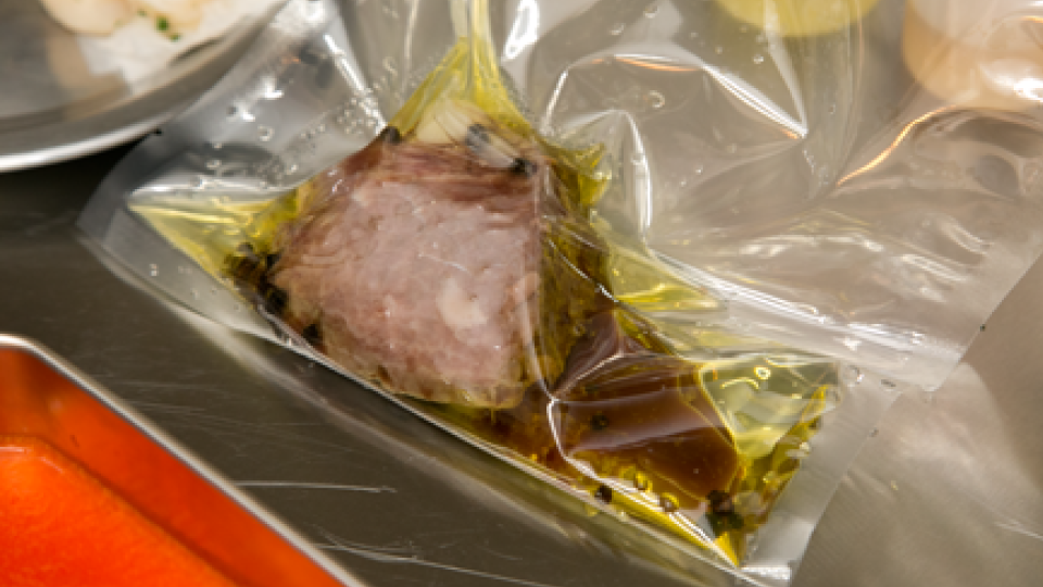 本来コンフィは大量の脂やオイルに食材を浸し、低温でじっくり火入れする料理です。ハーブやスパイスの香りが移り、しっとり仕上がるのが特徴ですが、一回使ったオイルは再利用できません。 真空パックを使えば、少量のオイルで調理ができて経済的。火入れにスチコンを使うと温度管理も正確ですし、その場から離れられるので、他の仕事に集中できます。 一食分ずつ調理することで、食材の廃棄ロスが出ないのも大きなメリットですね。