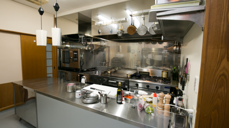 厨房はかつて居間として使っていたスペースを改築。シェフと奥様の導線に合わせて設計し、お客様に目配りできる場所に通用口を設けています。