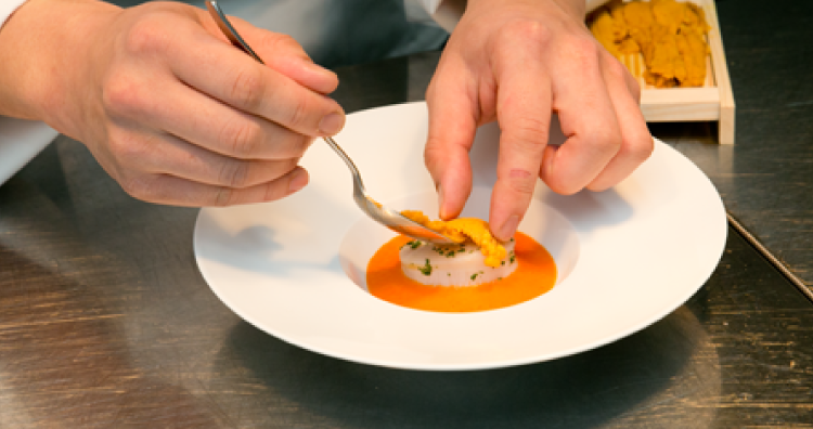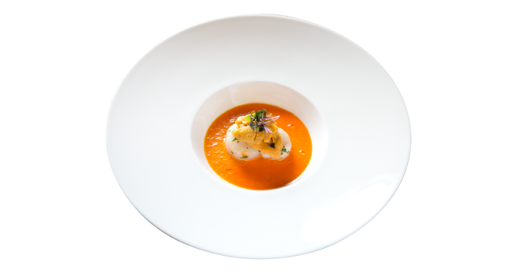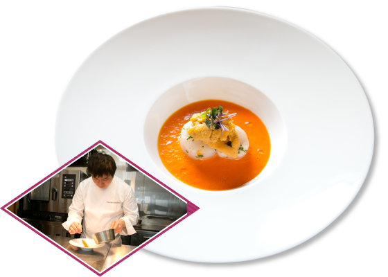 瀬戸内で立派に育った平貝の貝柱を、フランス料理の技法「ヴァプール」で調理。低温スチームで蒸し上げ、レアな食感を残しながら旨味を引き出します。赤パプリカの甘さと苦味、香り豊かなウニとの相性は抜群。今回ご好意により、シェフのオリジナルレシピを特別に公開いたします。