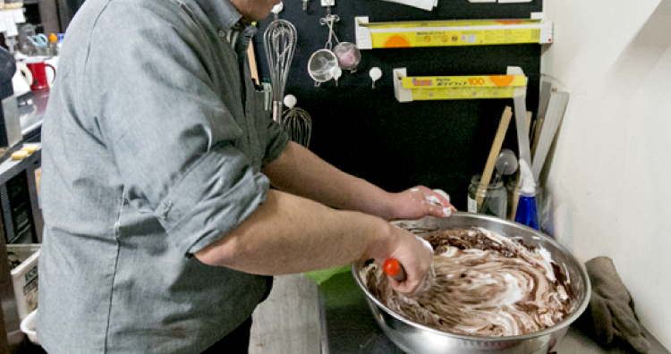 - ・<材料b>の薄力粉とココアをふるい合わせておく。