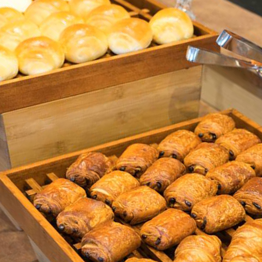 今年3月のオープン以来、国内外の多数の宿泊客で連日賑わっています。そのうちの約70%が朝食を召し上がるため、毎朝120~130人前のバイキングを用意。 スチコン2台を上下に積み、上はコンビモード、下はスチームモードで使い分けてフル稼働させています。鮭の塩焼きやベーコン、パンなどはコンビで焼き上げ、スチームは惣菜の温めや、温玉の調理などに。 パンは焼きたてを売りにしているので、減り具合を見ながら焼き足していますが、鮭の直後にパンを焼いても、ニオイ移りしないのがいいですね。