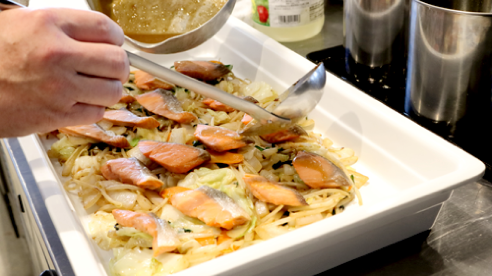 朝6時から10時の間に約50種の料理を用意しますが、売れ行きは日によって異なります。臨機応変かつスピーディーに対応するために、スチコンと他の熱源を組み合わせることが多いですね。例えば朝食で提供している「鮭のちゃんちゃん焼き」は、鮭はスチコンで焼き上げ、下に敷く野菜はフライパンで炒めます。朝食時はいつもスチコンが満タン状態。スチコン調理が望ましいものと、その他で対応できるものを区別することで、より早く提供できます。蒸気を入れながら焼いた鮭はふっくら、フライパンで炒めた野菜はシャキッとして、お客様にも好評ですよ。