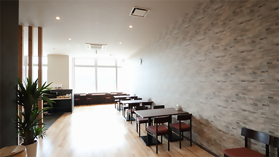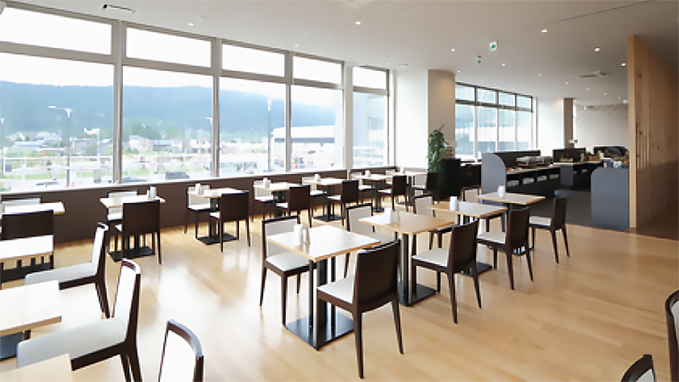総客席数100席。朝食とランチタイムのバイキング時はほぼ満席になるそう。