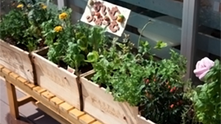 ミニ菜園「すいむふぁーむ」では、バジルやミント、タイムなどたくさんの種類のハーブが元気に育っている。