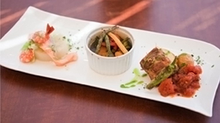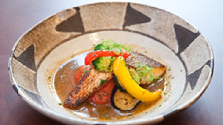 岡野さん自信作のクックエブリオ料理。「真鯛のポアレとトマトのコンフィ そのジュースと黒オリーブのソース」