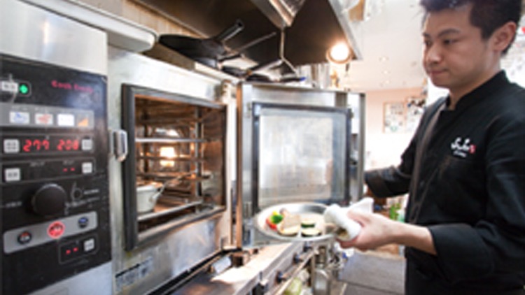 使い始めて8ヶ月くらいですが、すごく便利ですよ。たくさん入るし、この店にはちょうどいいサイズ。それに、使っていて楽しいですね。導入した2〜3ヶ月は、使う度に感動していました。扉がガラス窓なので中が見えるでしょ。ケーキなんかを焼くと膨らんでいくところが見えるから、それに見いってしまっていたこともあります。焼いてる間に、ほかのことができるというのにね(笑)。今でも新しい発見はあるので、それをいかした調理ができないかと、もっと使える方法を研究しています。今のところは、ある程度調理して最後の仕上げや温め直しの部分でスチコンを使うことが多いので、1から10までスチコンでという使い方はできていないのですが。マニュアル化も進めたいのでひと通りスチコンでできるようにもしたいですね。