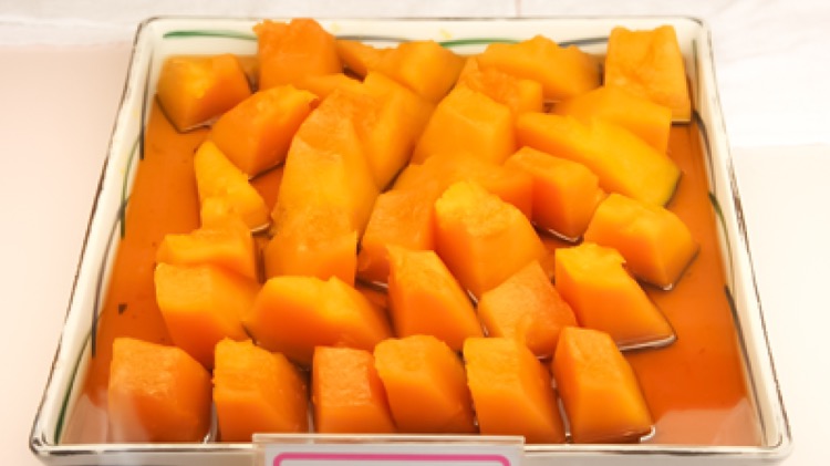 表面がつるつるでツヤツヤ、その美しい仕上がり具合から「どうやって煮ているの?」とお客さんによく聞かれるという「なんきん」(かぼちゃの煮物)。