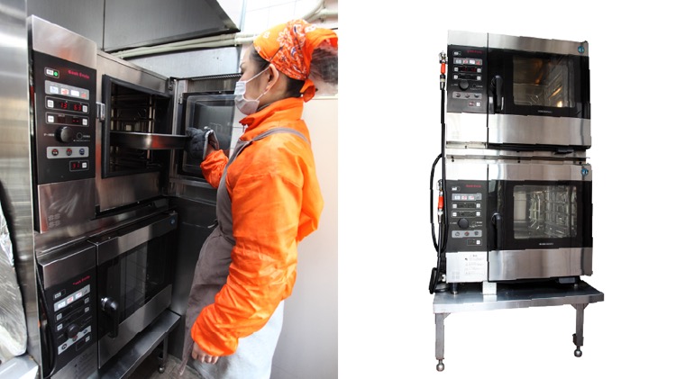 豊さん 仕込み中も、営業中もですが、よく作業が重なるときがあるんです。1台しかないと、調理している間に次の注文が入った時にスチコンが使えなくてお客さんの希望時間に間に合わない、というような事態がよく起こったんですよ。それで、買い替える時に2台導入しよう、と決めました。2台とも朝5時の仕込み開始から昼くらいまでフル稼働してます。