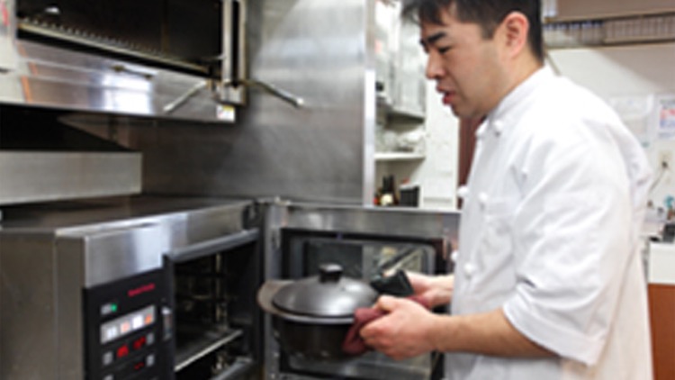 パーティーや宴会ですね。調理はほとんど僕ひとりでやってるので、大人数の料理をまかなうにはスチコンもひとりのスタッフだと思ってうまく使わないと。ガスコンロの火加減って結構難しくて、火が入り過ぎたとか少し弱かったとかで料理の出来映えも変わってくる。焼き過ぎてしまってパサパサになったらお客さんに出せませんからね。その点、スチコンなら火加減を見る必要もないし、コンビモードだと焼きながら蒸気も入るからふっくら仕上がる。人気メニューのハンバーグも、ランチタイムに大量に注文が入った時や宴会の時などにはスチコンを使いますね。ハンバーグは焼き過ぎると肉汁が出過ぎてしまいますから、芯温センサーを入れてちょうどいい温度で仕上げています。