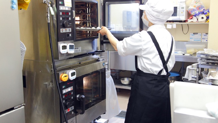 今だとメニューのうち、11点ほどをスチコンで調理しています。私はスイーツ担当なので、きなこボーロや小松菜のシフォンケーキ、ベイクドチーズケーキを焼いています。ホロホロッとした食感が人気のきなこボーロは生地を高い温度から低い温度に下げて焼くという2段階の工程が必要なんですね。スチコンなら工程をメニュー登録できるので、1回1回温度を合わせる手間もなく、登録した設定を呼び出してポンっとスタートボタンを押すだけ。後はスチコンにまかせて、放っておけばいいので助かっています。誰がやっても焼きムラなく、同じ仕上がりというのもうれしいですね。それに、グリルオーブンだと表面がパサつく野菜の焼きメニューも、スチコンのコンビモードを使うとふっくらとした状態で仕上がり、野菜の甘みも保てるんです。