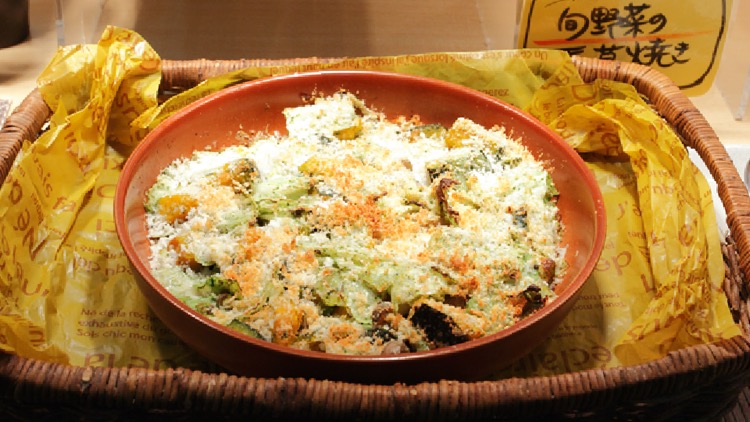 キャベツ、しめじ、かぼちゃなどがたっぷり入った「旬野菜の香草焼き」。スチコン調理でふっくら甘みのある仕上がりに。