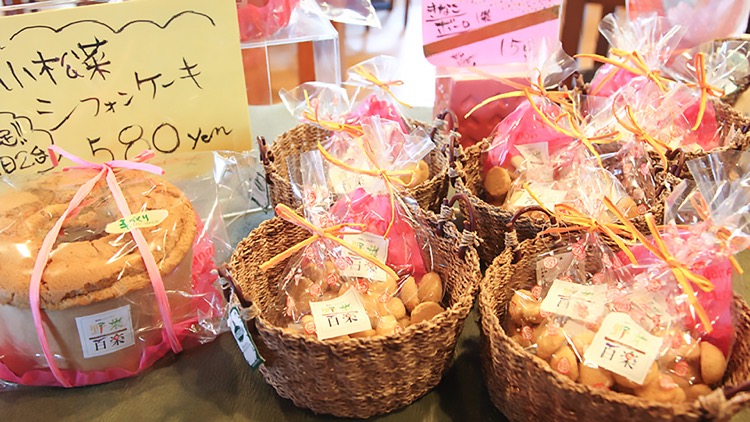 人気が高く、お客さまの要望に応えて物販されることになった「きなこボーロ」と「小松菜のシフォンケーキ」。