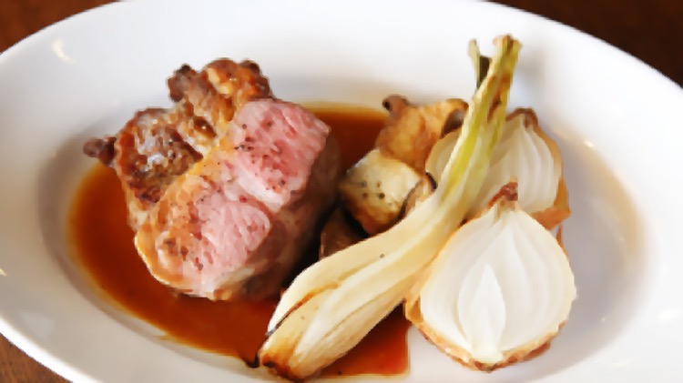 飯田産SPF豚の肩ロースのロースト(1,800円)。付け野菜にも信州中野産のエリンギを使用するなど、地産地消を大切にしている。