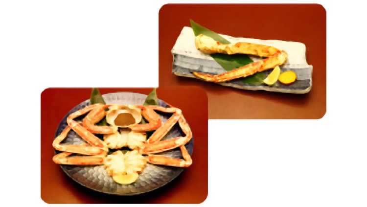 「ズワイかに姿焼き」(左下)5,775円と、「本タラバかに足一本焼き」(右上)2,625円。