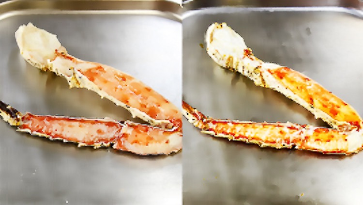 本タラバかに足を焼く前(左)と焼いた後(右)で比較しても焼き縮みがほとんどないのがわかる。