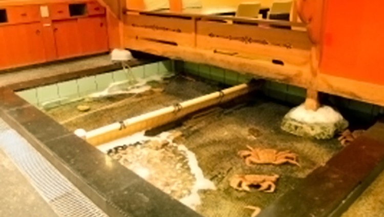 屋形船をイメージした内観。座席からかにの水槽が見える演出で海外からのお客様にも人気。