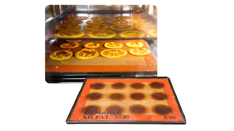 シロップ煮したオレンジを70〜80℃のホットエアーモードで乾燥させて作るオレンジチップ(左上)。 焼き菓子などに使用する天板はクックエブリオのサイズに合わせて特注した(右下)。