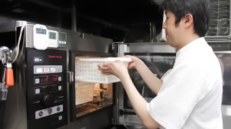 そうです。オープン前から調理は最小限の人数でやろうと決めていて、安定したものを提供できるスチコンは絶対導入したいと思っていました。テストキッチンで最初にクックエブリオを見た時、「コンパクトなのにすぐ温度が上がるし、仕上がりが安定していて、いいな」と思いました。うちの店は厨房が小さめなので、このサイズがよかったですね。設計は動線確保のためにミリ単位で設置場所から調理台の高さに至るまで、ホシザキさんにしてもらったんです。おかげで毎日スムーズに作業が進んでいますよ。